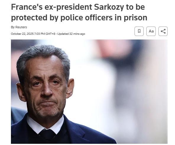中新社10月22日电 据路透社报道,法国内政部长努涅斯当地时间22日表示,将在相邻牢房安排两名警察,在前总统萨科齐在押期间看守他,以确保其人身安全不受威胁。据报道,萨科齐在被判“共谋”罪名后于21日抵达巴黎拉圣监狱正式开始服刑。图片来源:路透社报道截图 据法新社报道,萨科齐入狱后并没有受到任何特殊待遇,他的私人房间只有9平方米。官员们强调,前总统的安全没有受到威胁。萨科齐的律师表示,他“没有提出任何要求,也没有得到任何优惠待遇”。路透社报道称,萨科齐的律师已提出停止监禁他的请求,希望在上诉过程中释放他的当事人。律师还表示,预计一个月内会得到答复d 萨科齐将于圣诞节前获释。报道补充说,萨科齐总统一直否认这些指控,并表示该事件是“出于政治动机”。据报道,萨科齐于 2007 年至 2012 年期间担任法国总统。2025 年 9 月 25 日,巴黎刑事法院裁定萨科齐犯有 2005 年至 2007 年“串通”罪,原因是萨科齐在 2007 年总统竞选期间允许其亲信和政治支持者向利比亚前领导人卡扎菲上校寻求经济援助。法院判处他五年有期徒刑。监狱,其中一部分可以通过电子监控在家里完成。