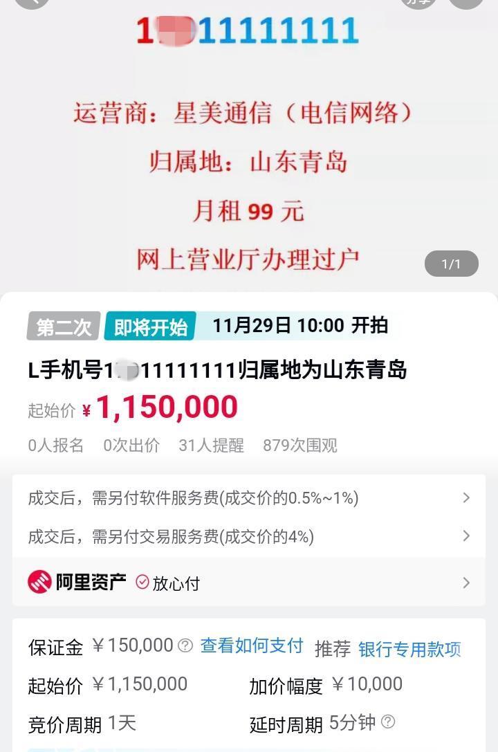 吉姆新闻记者 肖明远 11月25日,吉姆新闻记者看到,在阿里拍卖平台上,一款以八个“1”结尾的漂亮手机号将于11月29日再次拍卖,起拍价为115万元。此前起拍价为120万元,但拍卖失败。根据拍卖通知及物品描述,手机号码为1**11111111,月租99元,无欠费或其他限制,号码归属山东省青岛市,运营商为星美通信(私营运营商)。本作品起拍价为115万元,投标人需提前缴纳投标保证金15万元。要约价格的上涨幅度为1万元及其倍数。优惠时间为上午 10 点开始。 11 月 29 日至上午 10 点11月30日,报价成功后,我们将与中标人一起办理手机的交付手续电话号码。买家需要支付交易价格0.5%至1%的软件服务费和交易价格4%的交易服务费。 11月25日下午4点左右,《吉姆新闻》记者注意到,拍卖会现场有378名观众。这是该手机号码的第二次拍卖。 11月16日至17日,该手机号在阿里巴巴拍卖平台进行拍卖,起拍价为120万元,但无人出价,拍卖失败。当时的拍卖师告诉《吉姆新闻》记者,拍卖失败的原因有很多,将针对手机号码进行第二次拍卖。