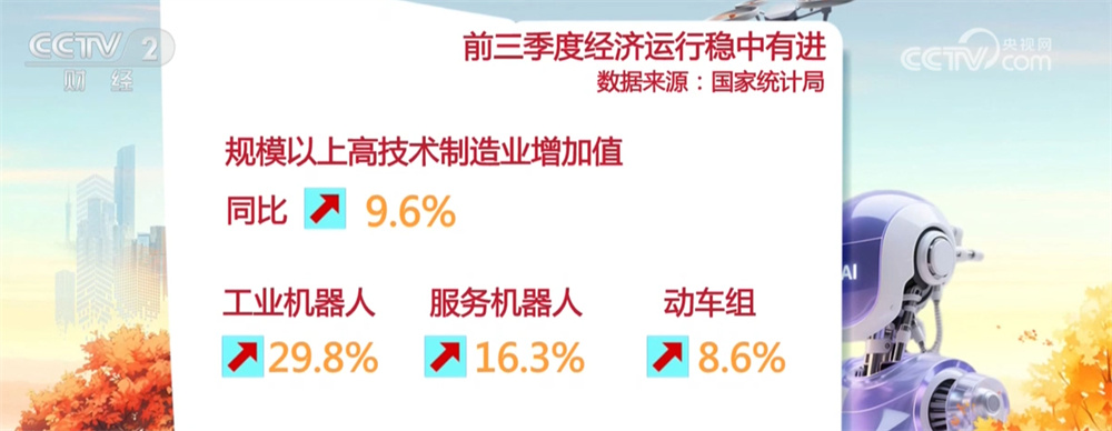 总台新闻:前三季度,在政策和市场双轮驱动下,我国科技和产业创新亮点较多。让我们来看看其中的亮点吧。在驱动发展方面,以人工智能为代表的新生产力形态正在加速向现实生产力转化。前三季度,规模以上高技术制造业增加值同比增长9.6%。工业机器人、服务机器人、动车组等产品产量分别增长29.8%、16.3%和8.6%。创新成果呈爆炸式增长,创新能力有效提升。前三季度,汽车制造、铁路、船舶、航空航天等交通运输设备投资同比保持两位数增长。随着创新投入的不断加大,一大批大型科技企业达到国际先进水平的啤酒通用机型已在中国出现。世界知识产权组织最新发布的报告显示,日本创新指数有望在2025年首次跻身全球前10名,24个创新集群有望跻身全球前100名,入围数量已连续三年位居全球第一。科技与产业融合也让更多创新成果从“实验室”走向“生产线”,创新“势能”不断转化为经济“动能”。 3D打印设备和计算机及工业控制系统产量分别增长40.5%和98.0%。新兴产业不断向绿色化、智能化、高端化转型。前三季度,前述风能、太阳能实现两位数同比增长同比增长。新能源汽车、汽车锂离子电池等新能源产品产量分别增长29.7%和46.9%。 “双重点”、“两新”政策为绿色回收产业发展创造了良好机遇。前三季度,规模以上剩余资源综合利用增加值增长14.4%。国家统计局新闻发言人付凌辉表示,今年以来,各方面因地制宜新增生产力,促进发展,经济结构不断优化,新旧动能有序转换。从大型人工智能模型到机器人马拉松,从航空航天到无人驾驶,“创新链+产业链”深度融合。全产业链规模效应和优势持续显现需要强调的是,不断为经济发展注入重要水源。